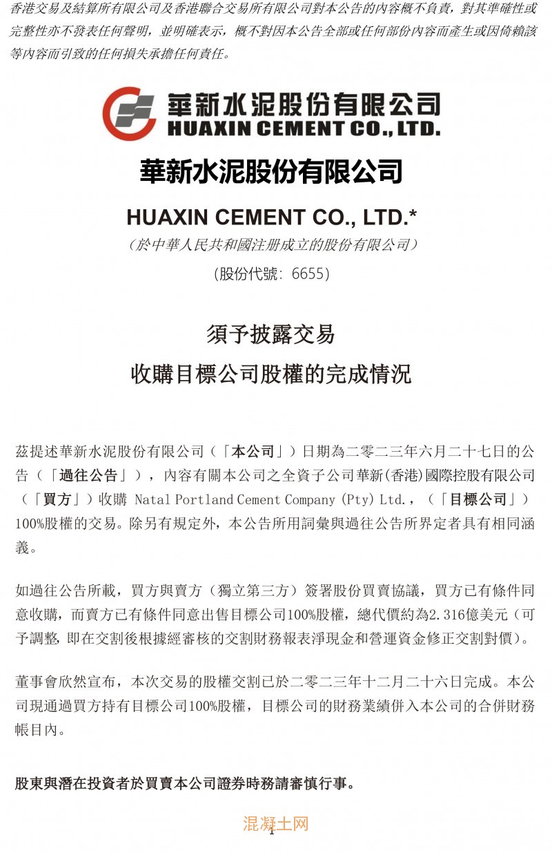 華新水泥(06655)發布公告,內容有關公司全資子公司華新(香港)國際控股有限公司(買方)收購 Natal Portland Cement Company (Pty) Ltd.,(目標公司)100%股權的交易。