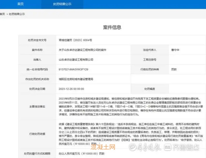 據青島市行政處罰與行政強制信息公示平臺信息,2023年9月11日,山東省住建廳執法人員在對山東卓亦達建設工程有限公司施工的東鼎企業管理集團職能總部項目(對應案名為雙利東旭未來城)進行質量安全輔助巡查中,發現該工程11#樓7層11×B~C墻、7層27×B~C墻、7層23×C~D墻等構件混凝土抗壓強度推定值不符合設計要求,經建設單位委托有資質的檢測公司對所涉及構件進行取芯檢測后,確存在有構件混凝土抗壓強度檢測數值不符合設計要求情況,涉嫌存在有不按照施工技術標準施工的其他行為的違法行為。依據有關規定,涉案項目施工方山東卓亦達建設工程有限公司被罰1萬元。