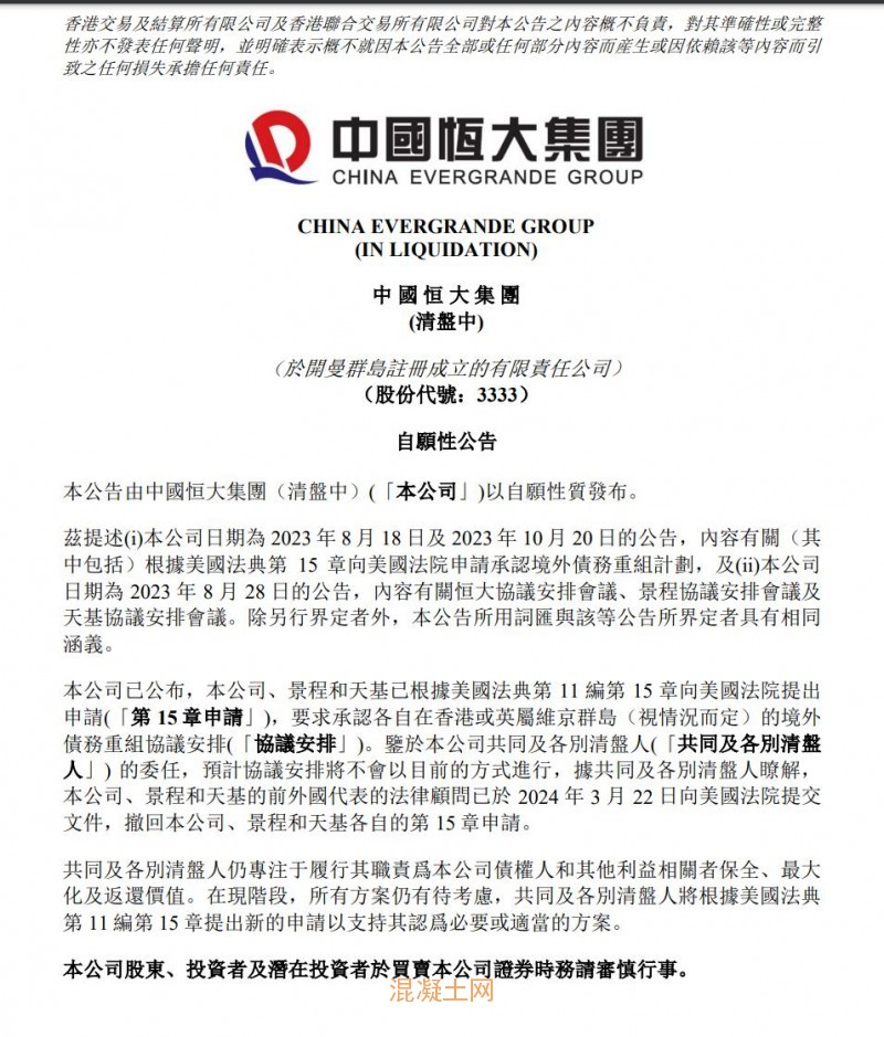 3月24日,中國恒大在港交所公告,公司此前披露已根據美國法典第15章向美國法院申請承認境外債務重組計劃,公司、景程和天基已向美國法院提出申請,要求承認各自在香港或英屬維爾京群島的境外債務重組協議安排。
