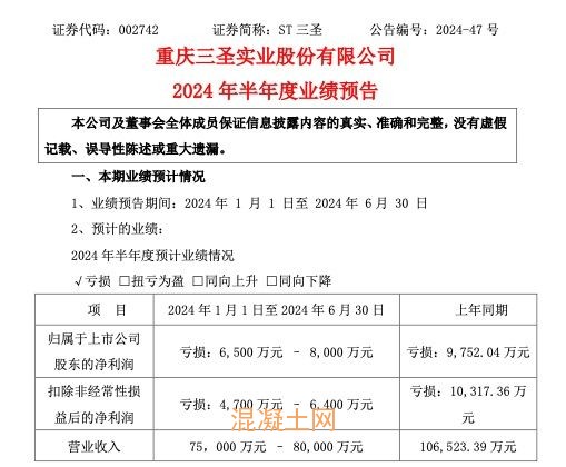 7月8日,重慶三圣實業股份有限公司(以下簡稱“ST三圣”或“公司”)發布2024年半年度業績預告。ST三圣稱,報告期歸屬于上市公司股東的凈利潤虧損6,500萬元–8,000萬元,上年同期為虧損9,752.04萬元;扣除非經常性損益后的凈利潤虧損4,700萬元–6,400萬元,上年同期虧損10,317.36萬元;營業收入75,000萬元–80,000萬元。