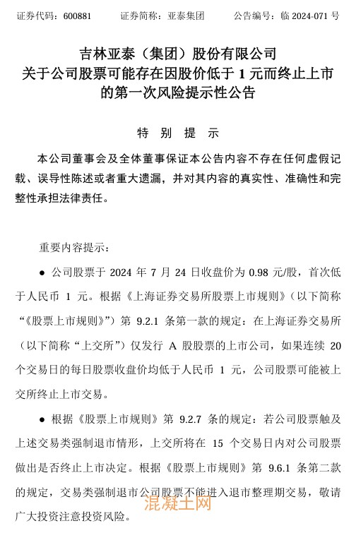 亞泰集團公告,公司股票于2024年7月24日收盤價為0.98元/股,首次低于1元。根據上交所規定,如連續20個交易日收盤價均低于1元,公司股票可能被終止上市。公司提示,若觸及強制退市情形,上交所將在15個交易日內做出是否終止上市決定,且公司股票不能進入退市整理期交易。