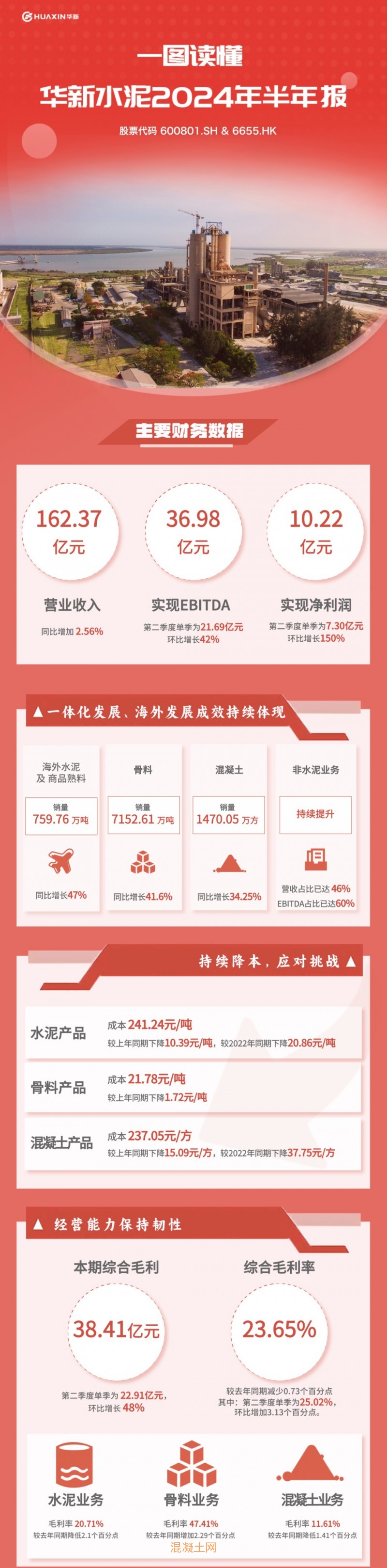 華新水泥發布2024年半年度報告稱,上半年,公司實現營業收入162.37億元,同比增長2.56%;受國內水泥及商品熟料價格和銷量同比下降影響,實現歸屬于母公司股東的凈利潤7.31億元,同比下降38.74%;實現水泥及商品熟料銷量2,848.44萬噸,同比下滑4.9%(其中:海外水泥及商品熟料銷量759.76萬噸,同比增長47.0%);骨料銷售7,152.61萬噸,同比增長41.60%;混凝土銷售1,470.05萬方,同比增長34.25%。