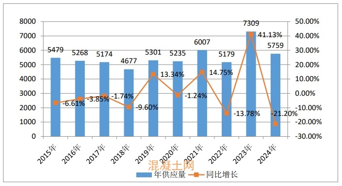 2024年全市預拌混凝土產能為10980萬m3,較上年增加260萬m3,當年產能利用率為52.45%,比上年下降了15.73個百分點。