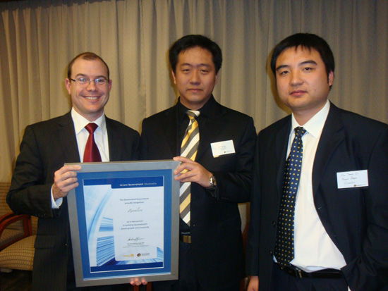 7月9日晚六時,在全場觀眾熱烈的掌聲和關(guān)注的目光中,中聯(lián)重科融資租賃澳洲分公司經(jīng)理白云帆、中聯(lián)重科海外分公司皮剛鄭重地從昆士蘭州政府投資發(fā)展部部長Andrew Fraser議員手中接過了昆士蘭州政府對于在該州投資企業(yè)的最高榮譽(yù)----“2008-2009財年昆士蘭州繁榮與發(fā)展重要合作伙伴”證書。此次獲頒證書的一共有四家企業(yè),而中聯(lián)重科是其中唯一的一家中國企業(yè)。這份榮譽(yù),不僅僅是當(dāng)?shù)卣畬χ新?lián)重科海外發(fā)展成果的認(rèn)可和贊許, 更昭示了以中聯(lián)重科為代表的中國企業(yè)赴澳投資發(fā)展的光明未來。