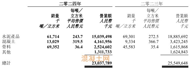 于2024年,該公司水泥產品、混凝土及骨料的平均售價分別為每噸人民幣 243.7 元、每立方米人民幣319.5元及每噸人民幣36.4 元,較2023年分別減少 10.6%、減少 12.9%及增加 2.8%。集團的水泥產品售價下調,主要是由于中國經濟增長及興建活動放緩所致。