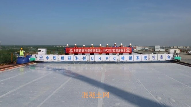 4月20日,濟濱高鐵濟陽黃河公鐵兩用特大橋首次超高性能混凝土(UHPC140)順利澆筑完成。本次澆筑的主橋公路層右幅E0—E13節間,鋪裝層尺寸為150m×15m×0.05m,單次混凝土用量達112m3。