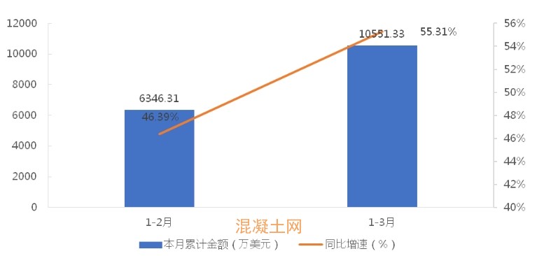 1-3月,我國混凝土泵車累計出口金額為10551.33萬美元,同比增長55.31%;累計出口數量為779臺,同比增長60.95%;出口均價為13.54萬美元/臺,同比下降3.56%。