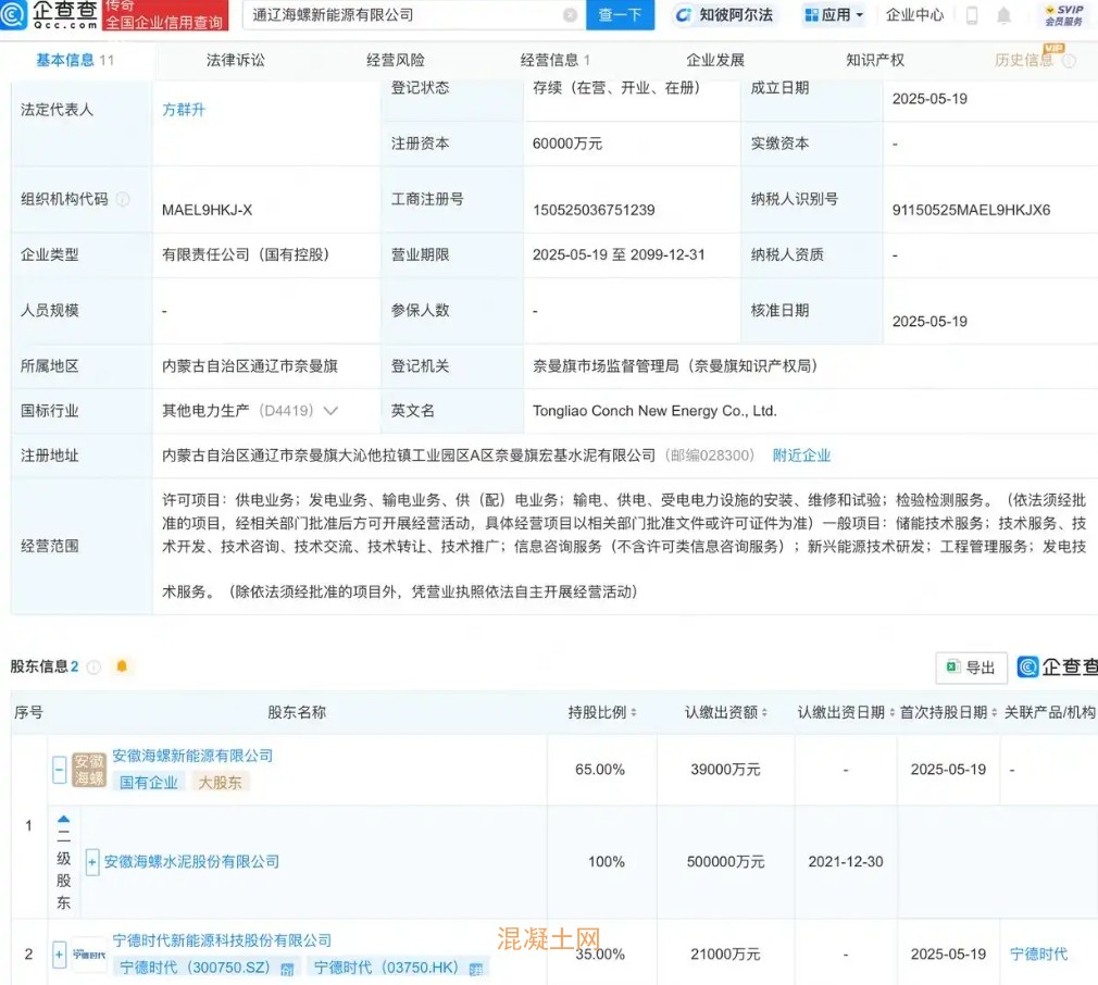 近日,通遼海螺新能源有限公司成立,法定代表人為方群升,注冊資本為6億元,經營范圍包括儲能技術服務、信息咨詢服務、新興能源技術研發等。 企查查股權穿透顯示,該公司由海螺水泥(600585)全資子公司安徽海螺新能源有限公司、寧德時代(300750)共同持股。