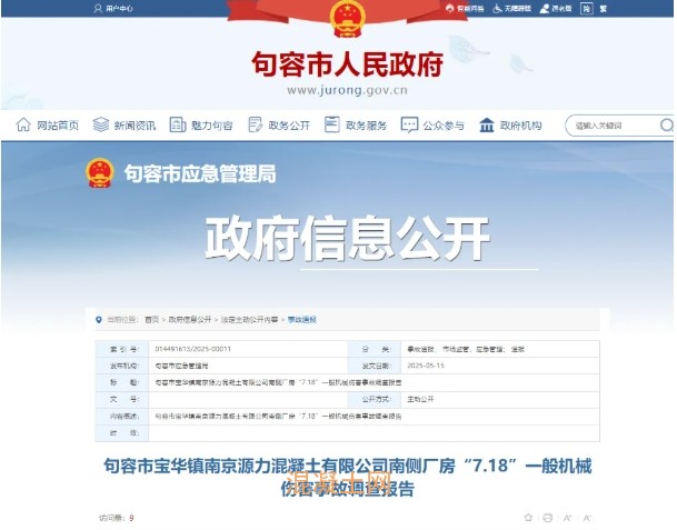 近日,句容市應急管理局發布《句容市寶華鎮南京源力混凝土有限公司南側廠房“7.18”一般機械傷害事故調查報告》。2024年7月18日10時30分許,在位于南京市棲霞區棲霞街道東陽社區境內的南京市源力混凝土有限公司南側廠房內發生一起一般機械傷害事故,造成一名工人死亡,直接經濟損失約100萬元。
