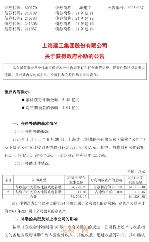 7月1日,上海建工發(fā)布《關(guān)于獲得政府補助的公告》。公告顯示,上海建工2025年至今累計獲得政府補助金額為5.48億元,對當(dāng)期損益的影響為4.94億元。其中,與收益相關(guān)的各地區(qū)政府補助2025年至今發(fā)生金額為5.48億元,占凈利潤的22.79%;與資產(chǎn)相關(guān)的各地區(qū)政府補助2025年至今發(fā)生金額為17.84萬元,占凈資產(chǎn)的0.00%。