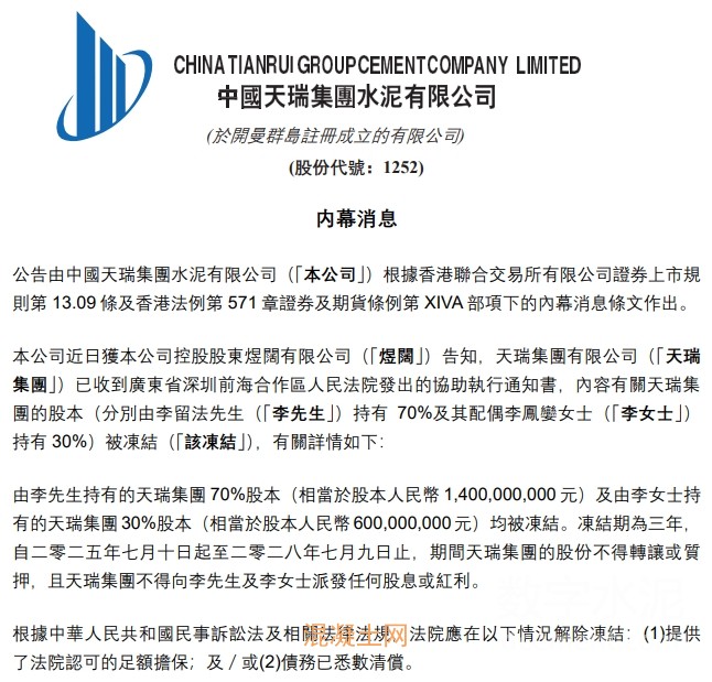 中國天瑞水泥7月20日在港交所公告,收到控股股東煜闊有限公司通知,李留法夫婦所持天瑞集團100%股份被深圳前海合作區人民法院司法凍結。凍結期為3年,自2025年7月10日至2028年7月9日,期間天瑞集團的股份不得轉讓或質押,且天瑞集團不得向李留法夫婦派發任何股息或紅利。