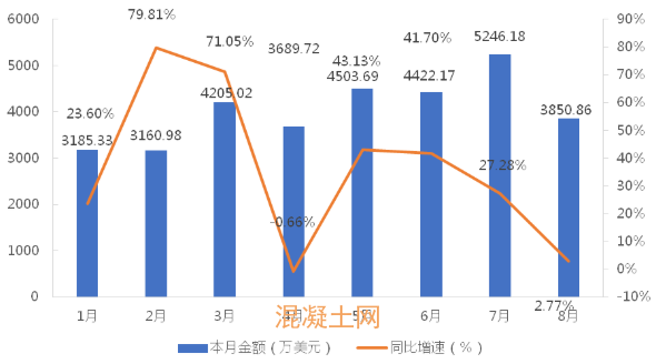 2025年1-8月我國混凝土泵車累計出口金額及同比增速