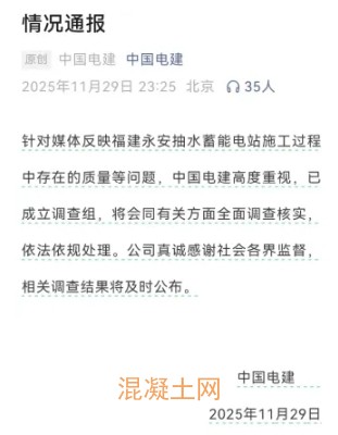 11月29日晚,中國電力建設(shè)集團(tuán)有限公司(以下簡稱“中國電建” 601669.SH)針對媒體反映的福建永安抽水蓄能電站施工質(zhì)量問題,通過官方渠道發(fā)布情況通報,宣布已成立專項調(diào)查組,將聯(lián)合有關(guān)方面全面調(diào)查核實,并承諾依法依規(guī)處理。