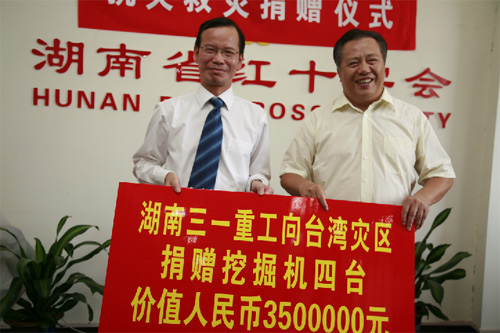 8月15日,由湖南省紅十字會組織的“湖南人民支援臺灣同胞抗災(zāi)救災(zāi)捐贈儀式”在湖南省紅十字會舉行,長沙市人民政府副市長、市紅十字會會長何寄華親自參加捐贈儀式,將100萬元的支票遞交給省人大常委會黨組成員、省政府顧問、省紅十字會名譽(yù)副會長唐之享,并從唐之享手中接過捐贈證書。參加本次捐贈活動并向臺灣同胞捐款的還有湘潭市政府、湖南省廣電局、湖南中煙公司、長沙培粹中學(xué)等單位,長沙有名的工程機(jī)械制造廠商三一重工和中聯(lián)重科則向臺灣災(zāi)區(qū)捐贈了價值500多萬元的工程機(jī)械,用于當(dāng)?shù)乜篂?zāi)救災(zāi)工作。