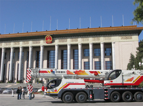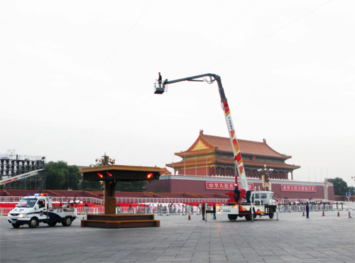 白天,天安門廣場正緊鑼密鼓的為國慶做現場布置。廣場兩側代表56個名族的巨大立柱非常顯眼。而我們的吊臂也高高聳立在廣場一側,在場內眾多專用設備中,它是唯一能在閱兵式那一天保持這種工作姿態出現在天安門廣場的設備。