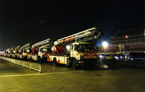 晚上10點鐘,高空作業車趕到了天安門廣場。6臺高空作業車身披專門設計的嶄新國慶涂裝,整齊劃一地排放在天安門城樓正對的長安街上,旋即引來眾多圍觀的目光。