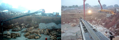 很快工地施工人員就喜歡上了這臺設備,他們說在泵車布料1 車混凝土的時間里,皮帶輸送機可以布料3-4 車料,這極大地提高了工作效率,保證了工程進度,其工作表現和經濟性都非常突出。 由于混凝土在皮帶機的尾膠管內沒有任何壓力,完全是靠本身重力的作用往下落的,所以決不會產生由于壓力突變而產生的尾膠管異常甩管,這不但對尾膠管操作手來說更安全,而且在不需要精確定位的情況下還可以不配置尾膠管操作手,由皮帶機操作手通過無線遙控器直接控制臂架的動作進行布料,所以在一定程度上也降低了勞動強度和布料成本。