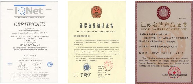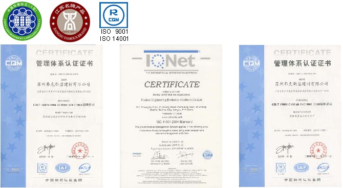 2007年企業被評為[江蘇省高新技術企業] 、FOX牌高性能聚羧酸減水劑被評為[江蘇省高新技術產品]、全國外加劑行業聚羧酸減水劑生產綜合銷量前三名的榮譽稱號,同時企業在2006年完成了質量和環境管理體系ISO19001-2000 ISO14001-2004的認證及07年度監督審核。2008年被評為江蘇省名牌產品稱號。