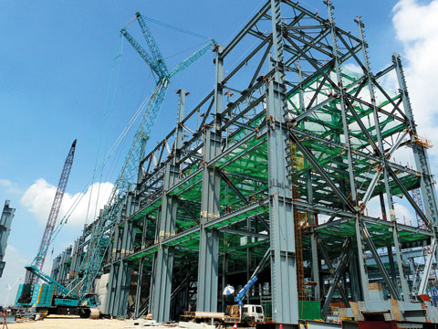 2008年7月,三一履帶起重機投入韓國現代鋼鐵廠的施工建設。截至目前,三一設備已運行3000多個小時,高效且安全環保的產品性能,在韓國廣受贊譽。圖為三一SCC3200履帶起重機正在進行吊裝作業,墨綠色的機身是應客戶需求量身打造。