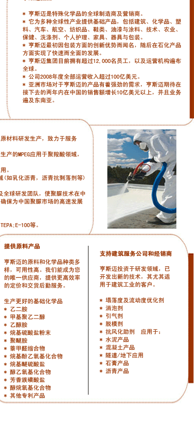 亨斯邁化工貿易(上海)有限公司 建筑工業化學品部 甘先生 地址:中國•上海•虹橋開發區興義路8號•萬都中心45樓 200336 電話:86-21-22087588 傳真:86-21-22087500 郵箱:[email protected] 網址:http://www.huntsman.com | ||