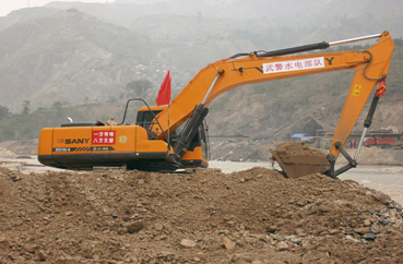 8月13日,應武警水電部隊之邀,三一重機再次緊急調派裝有破碎錘的SY215C及加長臂SY330C兩臺挖機,前往舟曲,積極配合救援工作。