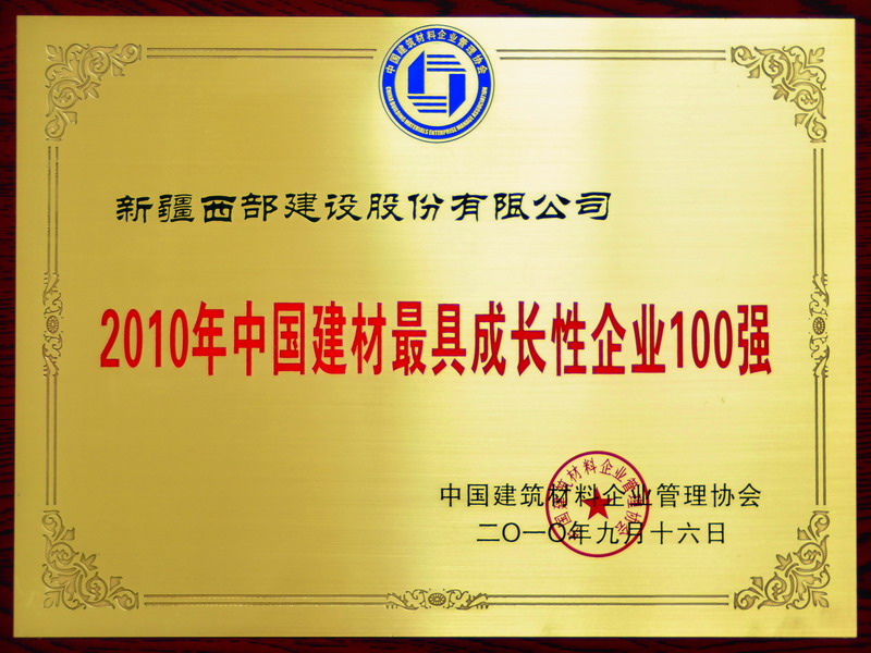 9月16日,2010年度中國建材500強發布會在北京隆重舉行,新疆西部建設股份有限公司榜上有名,并同時躋身2010年中國建材行業最具成長性企業100強。