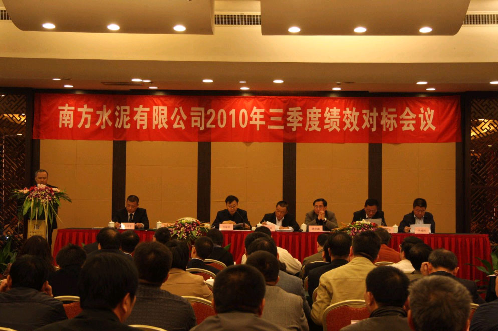 2010年10月30日,南方水泥管理整合暨三季度績效對標分析會在杭州召開。包括中國建材股份總裁、南方水泥董事長曹江林,中國建材股份副總裁、南方水泥黨委書記姚季鑫在內(nèi)的130名管理者出席了會議。會議由中國建材股份副總裁、南方水泥總裁肖家祥主持。