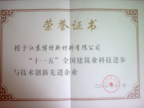 11月25~26日,全國建筑業“十一五”科技創新先進單位與個人表彰大會暨經驗交流大會在北京友誼賓館隆重舉行,江蘇博特新被授予“十一五” 全國建筑業科技進步與技術創新先進企業。