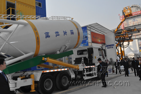 本屆展會公司主要推出的產品主要有HZS100混凝土攪拌站、干拌砂漿背罐車、干拌砂漿儲料罐、砂漿攪拌器等,其中HZS100混凝土攪拌站引起了許多參展者的注意,人們紛紛駐足觀望。公司市場部副經理薛江偉先生向中國混凝土網記者介紹,該混凝土攪拌站不同于其他拌站,該攪拌站是行業內首款免基礎、集裝箱式混凝土攪拌站,雖然從外觀看來體積較其他拌站縮小很多,但功能卻非常強大,集普通拌站的一切功能于一身,但比普通拌站更加靈活。該攪拌站采用模塊式設計,無需基礎,便于設備轉場及集裝箱運輸。很多參展商對此款設備產生了濃厚的興趣。