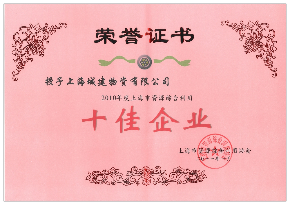 1月12日,在上海市資源綜合利用協會工作年會上,經企業自薦、專委會推薦,評選工作組初選、復選,評選領導小組討論通過,網上公示等程序,上海城建物資有限公司被授予2010年度上海市資源綜合利用十佳企業。