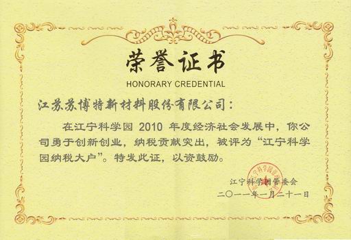 1月21日,江蘇博特新材料有限公司被南京江寧科學(xué)園管委會(huì)授予“江寧科學(xué)園納稅大戶”榮譽(yù)稱號(hào),并頒發(fā)了榮譽(yù)證書(shū)。