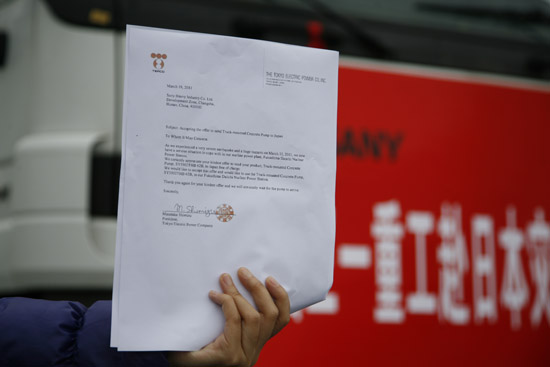 3月19日,三一重工收到署名為日本東京電力公司總裁清水正孝的函,其中寫到:“眾所周知,在2011年3月11日,日本經歷了一場巨大的海嘯災難。而現在,我們還面臨著福島核電站的巨大危機。我們萬分感謝貴方向日本免費提供SY5502THB 62米混凝土泵車這一幫助。同時,我們也愿意接受并在福島核電站的搶險中使用貴方提供的SY5502THB 62米泵車。請接受我們最真誠的感謝,我們也急切的盼望貴方的泵車盡早來到日本。”