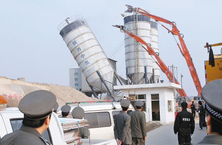 30日,記者在陜西中凱鐵路混凝土有限公司看到,該攪拌站的沙石全部隨意堆在廠區,沙堆緊貼著值班房,足有5米高,隨時都有將房子壓塌的危險。經查,該公司無土地、環保手續,不規范施工導致廠區周圍塵土飛揚,嚴重影響周邊群眾的身心健康。昨日,執法人員還對陜西華清物流有限公司的違法建筑依法進行了強制拆除。