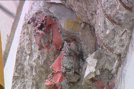 混凝土中夾雜的紅色氈布