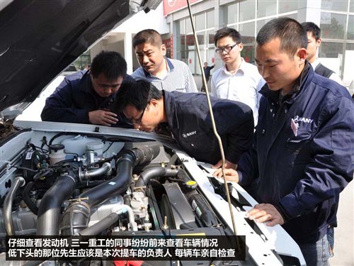 在提車中,三一重工的工作人員對車輛進行了仔細的檢查。畢竟是新車,都希望自己的車型沒有任何的問題。前后大燈成了每臺車必檢查的項目,駕駛員坐在車內,車前車后都有專人查看閃燈的情況,每一個步驟都沒有出現問題。廠方在車輛出廠時對車輛都有一定的檢查,如果有問題一定會進行調整。