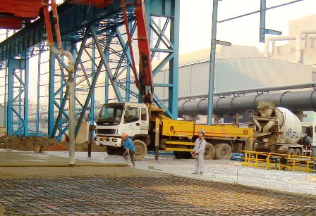 在此之前,十三冶城建分公司沙鋼攪拌站已經多次為沙鋼高爐項目和永鋼高爐項目澆筑各種不通規格、型號的耐熱混凝土,且產品質量全部合格。其中最高規格的耐熱混凝土能夠承受的最高溫度已達1200攝氏度。沙鋼攪拌站多年來通過對特殊混凝土生產技術的潛心研究,已經熟練掌握了1200攝氏度以下不同規格耐熱混凝土的生產技術。(圖為永鋼高爐地坪澆筑現場)