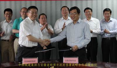 5月24日下午,集團黨委書記衛金木、副總裁葛津、首席運營官王清在集團大廈會議室親切會晤來訪的安徽省蚌埠市政府周春雨市長、張孝成常務副市長,以及淮上區區委書記宋長士、禹會區區委書記宋家傳一行,雙方就安徽省蚌埠市基礎設施建設及民生工程建設等合作項目進行磋商,并在洽談磋商后簽署戰略合作框架協議。