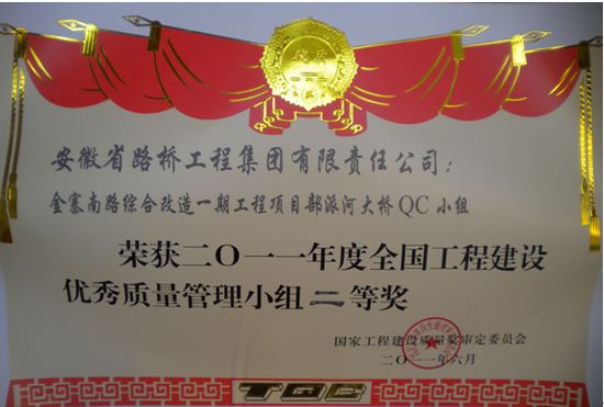 路橋集團(tuán)金寨南路綜合改造一期工程派河大橋QC小組在今年5月獲得 “2011年安徽省工程建設(shè)優(yōu)秀QC小組一等獎(jiǎng)”后,近日再次傳來(lái)佳訊,在2011年度全國(guó)工程建設(shè)質(zhì)量管理小組活動(dòng)成果發(fā)布會(huì)上,榮獲 “二〇一一年度全國(guó)工程建設(shè)優(yōu)秀質(zhì)量管理小組二等獎(jiǎng)”。