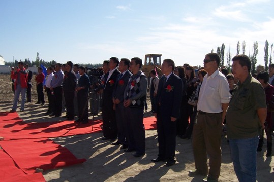 圖為2011年9月19日,該項目一期工程建設開工奠基儀式現場,江蘇榮能集團股份有限公司董事、新疆榮能新材料有限公司總經理董廣安先生向現場來賓致辭。