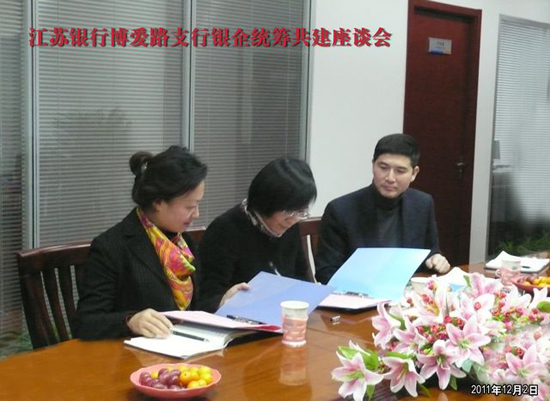 2011年12月2日下午,江蘇銀行博愛路支行銀企統(tǒng)籌共建座談會(huì)在江蘇銀行博愛路支行會(huì)議室輕松而愉悅地進(jìn)行。來(lái)自江蘇銀行常州分行副行長(zhǎng)、紀(jì)委書記王書記、江蘇銀行博愛路支行呂行長(zhǎng)、江蘇偉業(yè)建設(shè)集團(tuán)酈萍副總裁及華冠電器、新華石油、大華印刷等企業(yè)在內(nèi)的黨務(wù)負(fù)責(zé)人參加了此次會(huì)議。