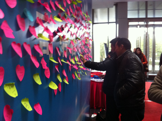 嘉賓在“成就20年、關(guān)懷每一天”寄語(yǔ)墻上寫下對(duì)中聯(lián)重科的祝福