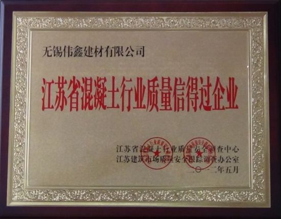 無錫偉鑫混凝土自投產(chǎn)以來始終堅持“質(zhì)量第一,用戶至上”的服務(wù)宗旨,在質(zhì)量上高標(biāo)準(zhǔn)、嚴(yán)要求,狠抓產(chǎn)品質(zhì)量,提升服務(wù)質(zhì)量,規(guī)范工作質(zhì)量。在本公司全體員工的共同努力下發(fā)揚(yáng)“拓市場、活管理、樹品牌的偉業(yè)精神和團(tuán)結(jié)拼搏、務(wù)實開拓的創(chuàng)業(yè)精神,在短短一年多時間內(nèi),已在混凝土市場占據(jù)一席之地,混凝土質(zhì)量得到了上級部門的認(rèn)可和用戶的肯定。經(jīng)過行業(yè)推薦和專家評定,2012年5月無錫偉鑫公司獲得“江蘇省混凝土行業(yè)質(zhì)量信得過企業(yè)”光榮稱號,提升了企業(yè)知名度和產(chǎn)品的競爭力。