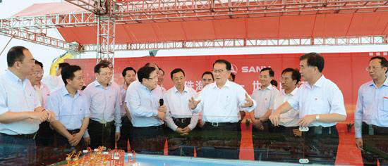5月17日,中共中央政治局常委李長春來到三一珠海產業園視察。讓外人頗感意外的是,視察之地沒有選擇在珠海產業園已經建好的漂亮廠房,也沒有選擇在三一員工整潔干凈的生活園區,而是定在了略顯偏僻的主基地建設現場。這里瀕臨大海,沒有人煙,荒涼的灘涂上,只有三一的建設者們在揮灑汗水。