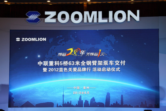 6月20日上午,2012中聯重科混凝土機械公司“藍色關愛”品牌行在江蘇泰州碧桂園酒店正式啟動。伴隨著現場LED大屏幕畫面亮起,標志著年度品牌行四大服務活動“凝愛心、踐諾行”、“一站式服務”、“尋找感動瞬間”和“服務之星評選”同時啟動,現場百余人共同見證了這一榮耀時刻。2012年是中聯重科成立二十周年,風雨兼程二十載,一路拼搏一路歌,借此契機,中聯重科混凝土機械國際公司面向全國十個大區,推出2012“藍色關愛”品牌行,開啟了新一輪的感動之旅。