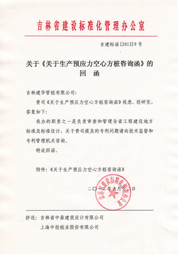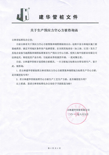 近日,記者從吉林省標準辦公室獲悉,建華管樁集團致函該辦公室咨詢空心方樁生產事宜。在這封《關于生產預應力空心方樁咨詢函》中,建華管樁提到:“目前吉林省關于預應力空心方樁圖集及規程將陸續出臺,這將豐富吉林地區施工樁基礎類型,滿足不同地區、條件客戶的選擇需要?!?nbsp;在肯定空心方樁之后,該函詢問吉林省標準辦:如果吉林省空心方樁圖集及規程出臺后,吉林建華管樁按照相關圖集及規程、空心方樁生產工藝生產空心方樁是否屬侵犯專利?