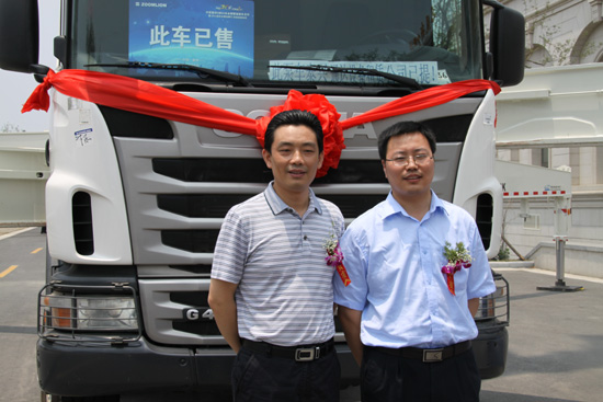 泰興通達建筑機械設備租賃有限公司葉劍總經理(左一)與中聯重科混凝土機械營銷公司總經理王永祥在泵車前合影