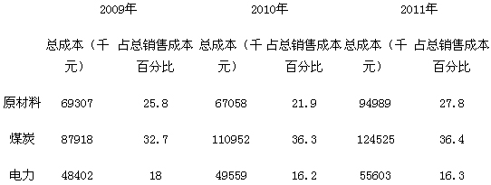 東吳水泥的原材料和煤炭主要通過采購,沒有自有的礦山或者煤礦,因此價格受到市場波動影響較大。如表2和表3的數據顯示,在生產總量基本保持平穩的情況下,石灰石采購成本從2009年的6930.7萬元上升至2011年的9498.9萬元,增加了37%左右,而煤炭也是在不斷上漲,從2009年的8791.8萬元上升至2011年的12452.5萬元,增加了41.6%。