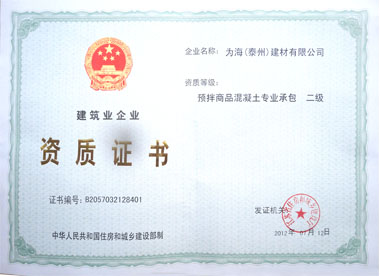 7月12日,為海(泰州)建材有限公司通過江蘇省住房和城鄉建設廳批準,并經過一個月的公示無異,原三級資質成功晉升為預拌商品混凝土專業承包二級資質,此為預拌商品混凝土行業最高資質,可生產各種強度等級的混凝土和特種混凝土。據悉,為海(泰州)建材有限公司是泰州地區唯一具備二級資質的混凝土企業。