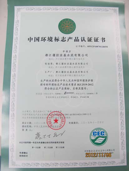 2012年11月6日,中國環境標志低碳水泥標準實施新聞發布會暨首批獲得中國環境標志低碳水泥產品認證示范企業頒證儀式在環境保護部環境發展中心正式召開。拉法基瑞安旗下四川都江堰廠、重慶南山廠和地維廠、云南富民廠以及其他10家水泥廠在此次發布會上獲得中國環境標志低碳水泥產品認證示范企業稱號,成為首批獲此殊榮的企業。環保部科技標準司、科學技術部社會發展司、中國建筑材料科學研究總院以及水泥協會和環境認證中心的領導出席了此次新聞發布會,并為獲得認證示范企業的單位頒發了低碳水泥標志。