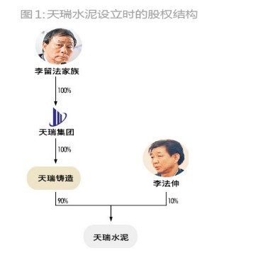 這些承包、收購而來的國有/集體水泥企業(yè),成為了天瑞集團水泥業(yè)務(wù)最早的家底。2000年9月28日,以這些家底作為基本資產(chǎn),李留法組建了天瑞集團水泥有限公司。成立伊始,天瑞水泥的注冊資本為500萬元,由天瑞集團全資擁有的天瑞鑄造持股90%,剩余10%由李留法的胞弟李法伸持有(圖1)。
